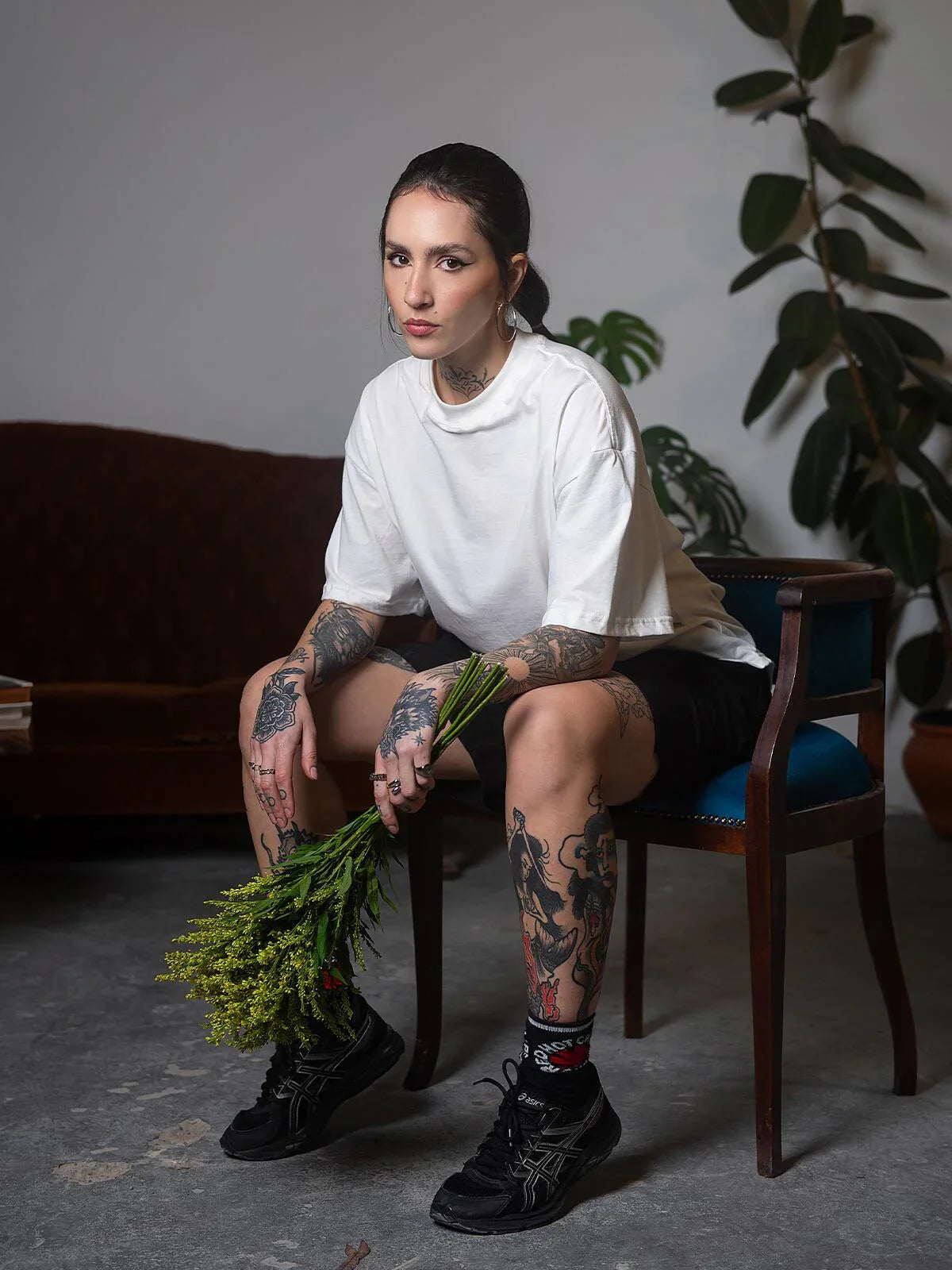 A Camiseta Boxy Off White é uma peça essencial para quem busca aliar estilo e conforto em um único look. Com seu design oversized e mangas alongadas, ela oferece um caimento único, perfeito para composições urbanas e despojadas.