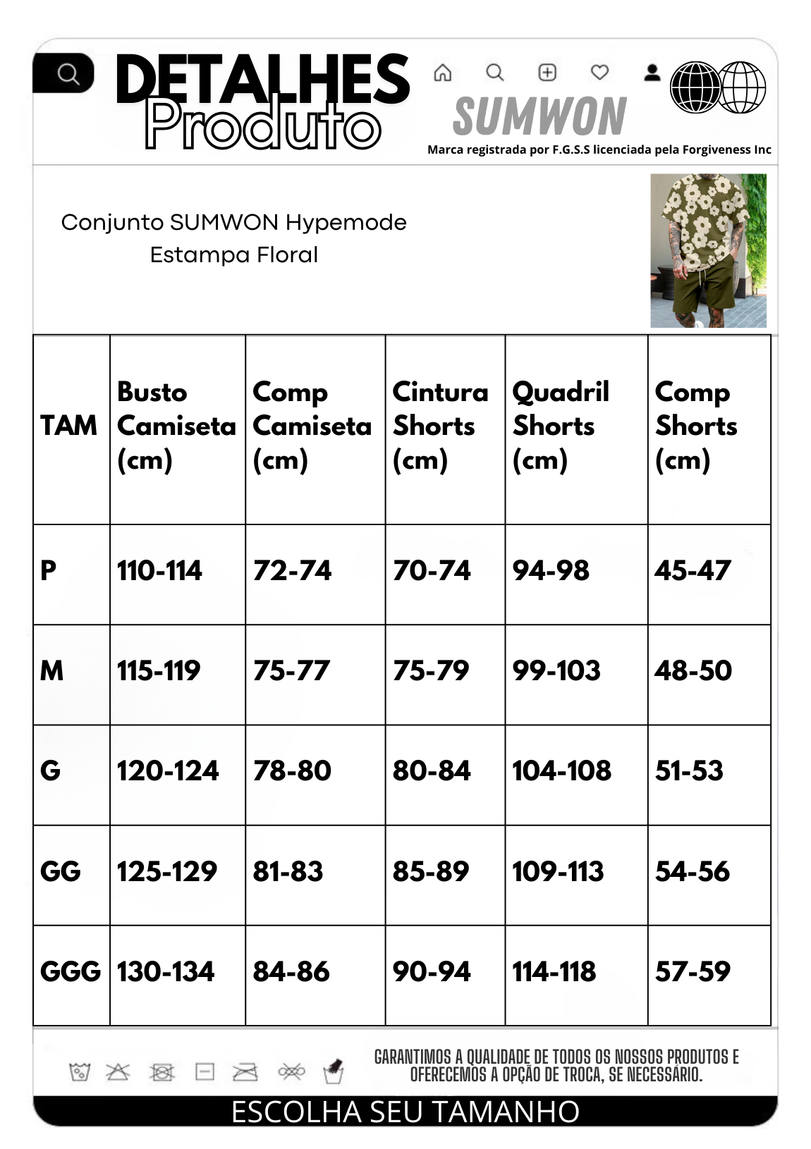 | TAM | Busto Camiseta (cm) | Comp Camiseta (cm) | Cintura Shorts (cm) | Quadril Shorts (cm) | Comp Shorts (cm) |