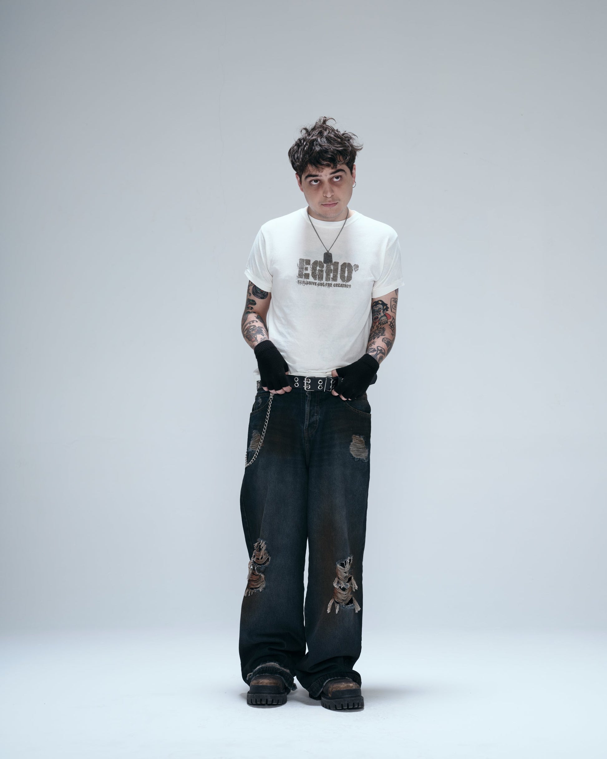Modelagem regular da EGHO, com caimento reto e gola justa. Desgastes feitos a mão, confeccionada em malha gaze 100% algodão de gramatura leve, com costura single stitch. Tecido poroso e toque macio resultam em uma peça solta e confortável. Estampa em silk realizada por dentro da peça para um efeito envelhecido.