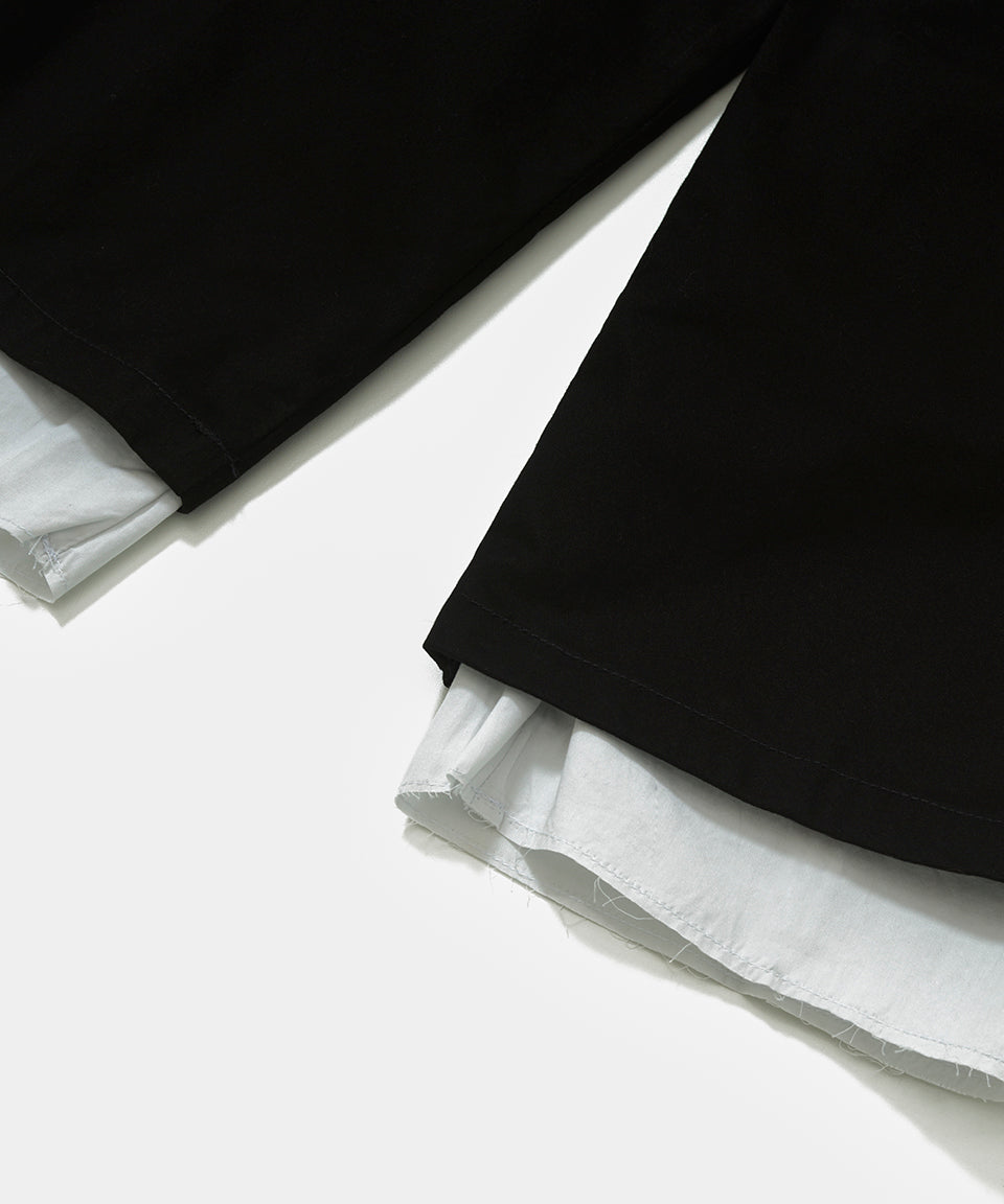 A Lined Chino Wide Leg Trousers é uma calça wide leg preta confeccionada em sarja com forro interno em tricoline branco a fio, que aparece de forma sutil durante o uso. Possui bolsos faca frontais funcionais e bolsos traseiros de alfaiataria com fechamento por botão. O cós traz etiqueta Union Made e a modelagem é ampla, garantindo caimento moderno e confortável.