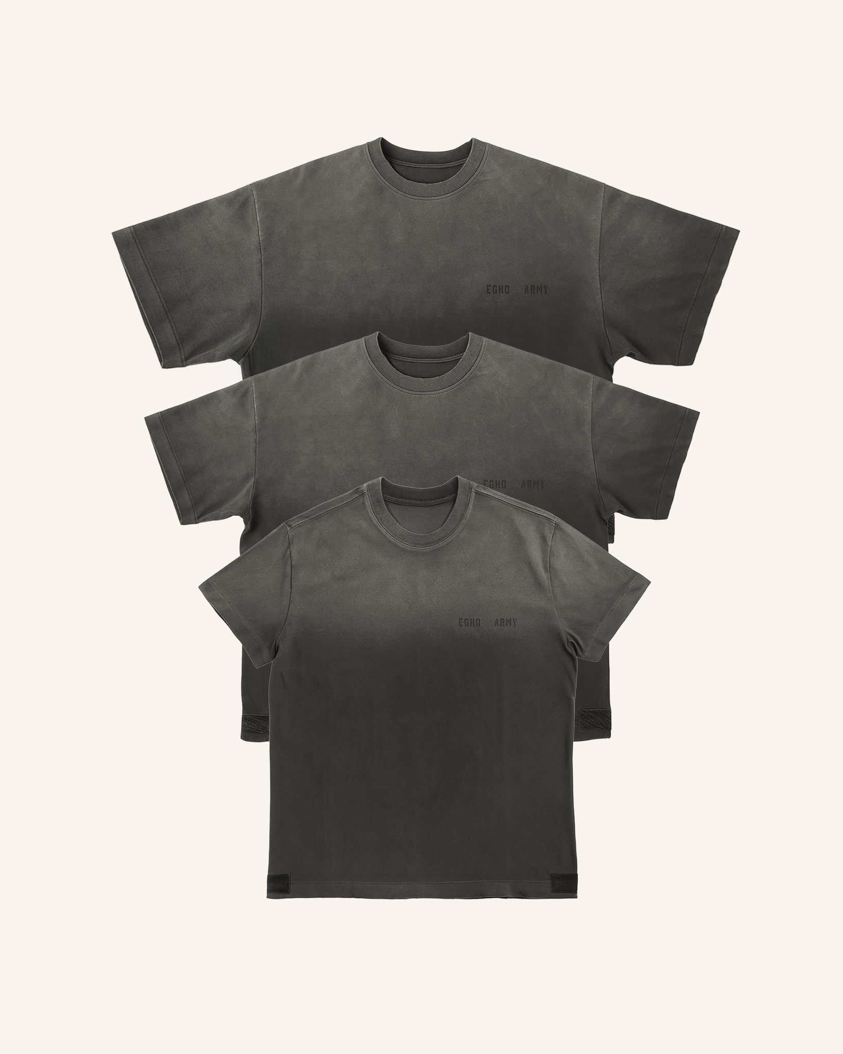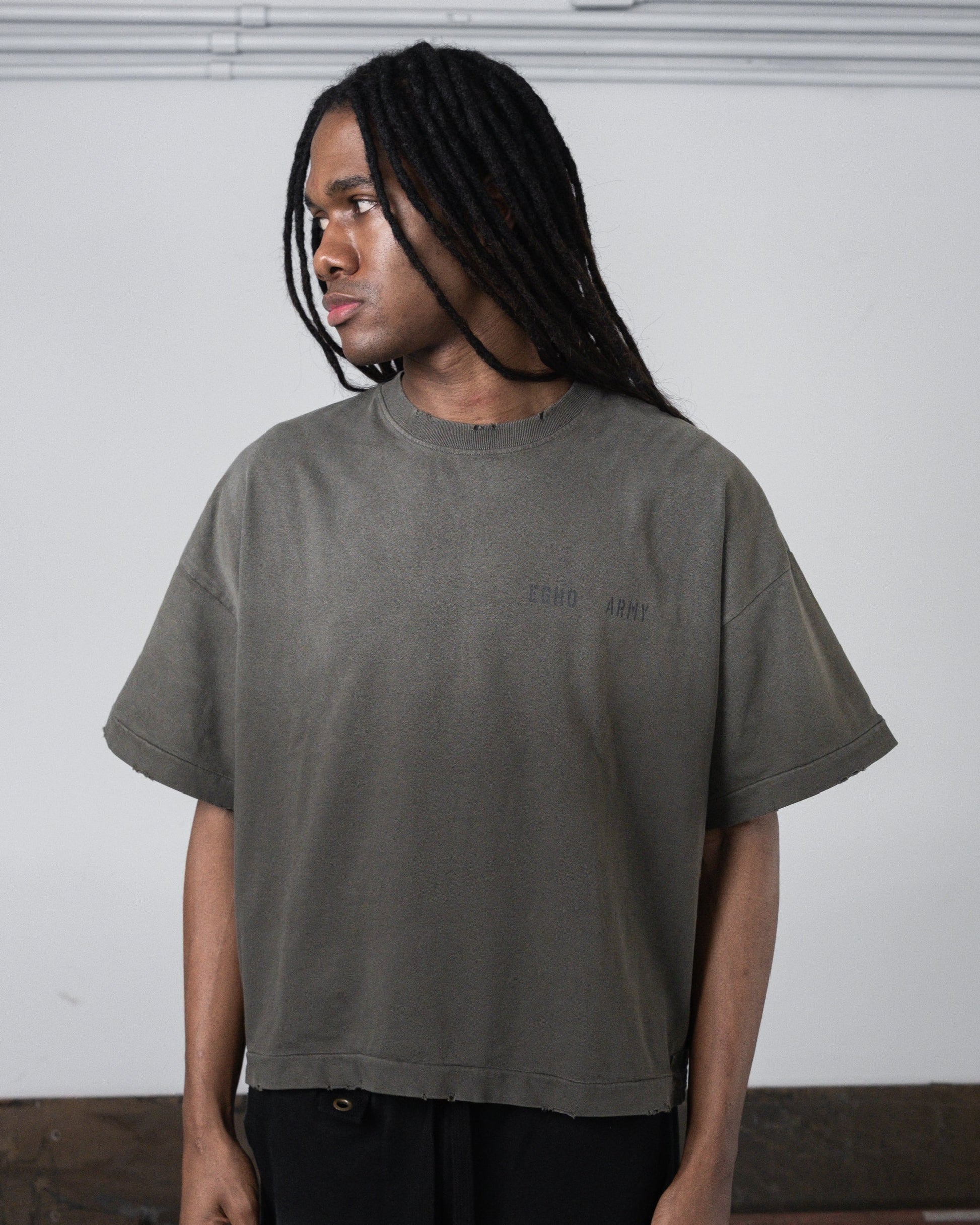 CAMISETA NA MODELAGEM OVERBOXY DA EGHO. COSTURA SINGLE STITCH. FEITA DE TECIDO 100% ALGODÃO DE ALTA GRAMATURA 274 GSM, PASSA POR PROCESSOS DE LAVAGEM PARA UM EFEITO ENVELHECIDO, PUÍDOS NAS EXTREMIDADES E Estampa em silk de subtom com acabamento desgastado.