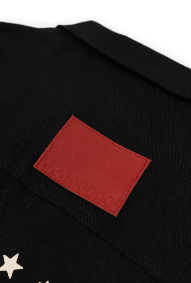 A parte da frente possui um bolso para pequenos objetos estampado em silk screen. Já suas costas são ricas em detalhes, costurada na parte superior a etiqueta vermelha da coleção é um destaque à parte. Complementado com arte gráfica uma mistura de técnicas envolvendo bordado e silk screen.