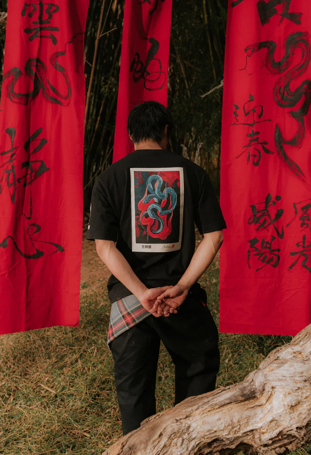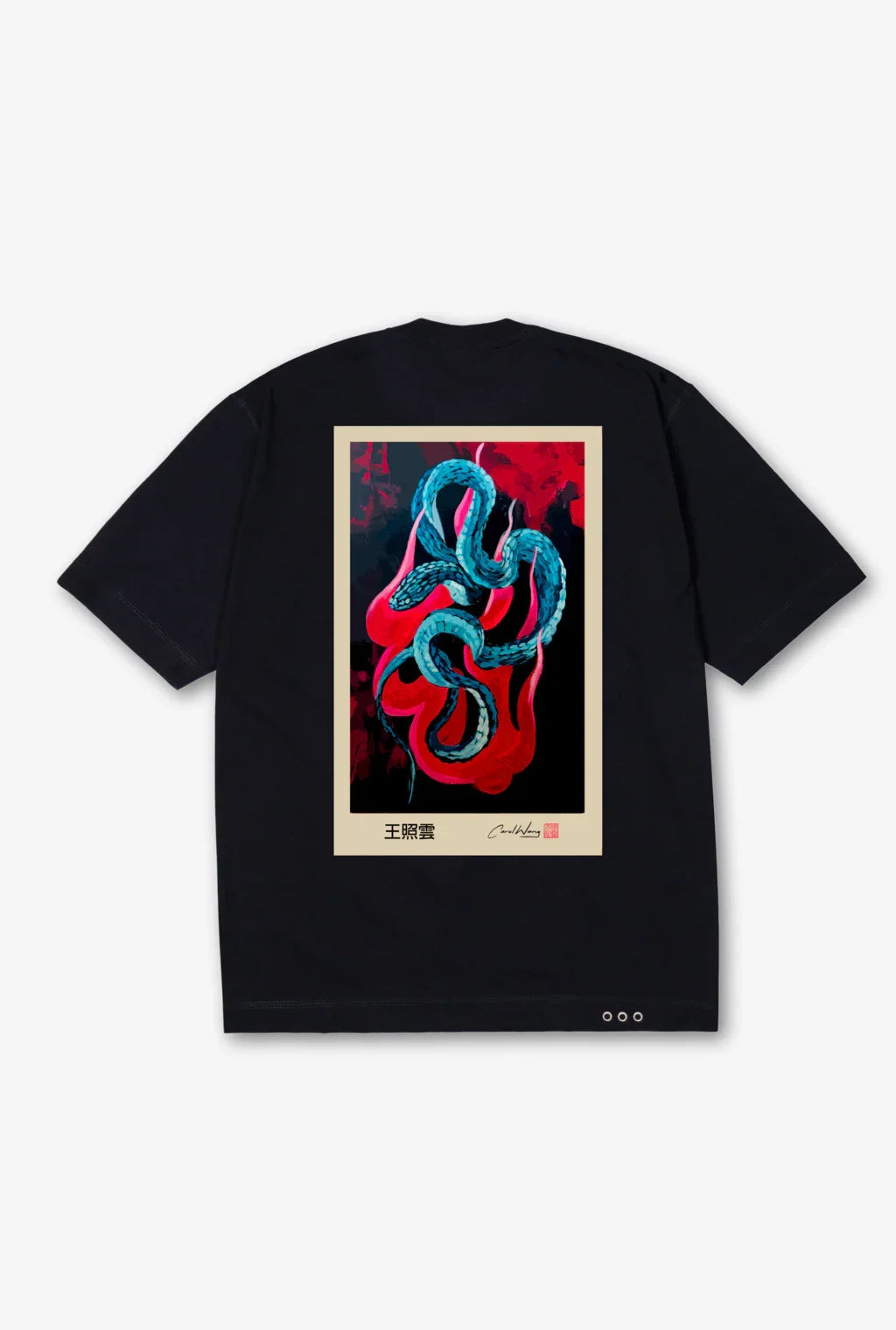 O grande destaque está nas costas: uma tela sobreposta e bordada à camiseta, simulando a aplicação de um quadro. Essa “tela” é estampada com a obra principal da coleção, a serpente azul em movimento sobre fundo vermelho, trazendo a experiência da galeria para o vestuário. A finalização vem com três ilhoses aplicados manualmente na barra, que reforçam textura e autenticidade.