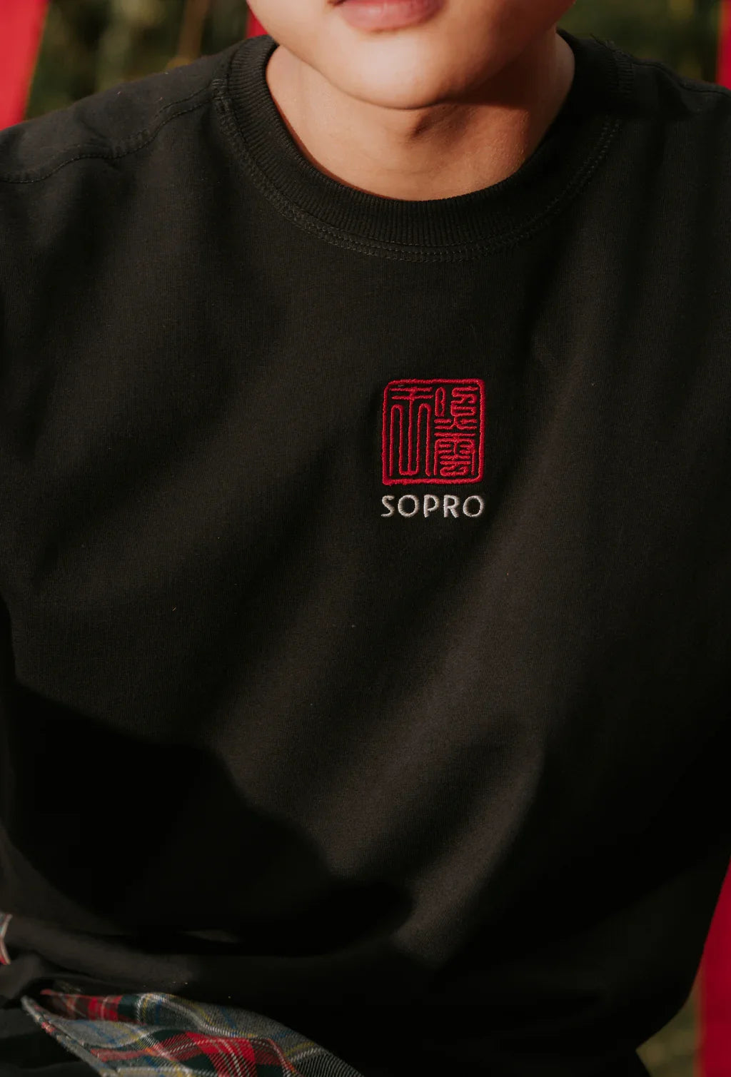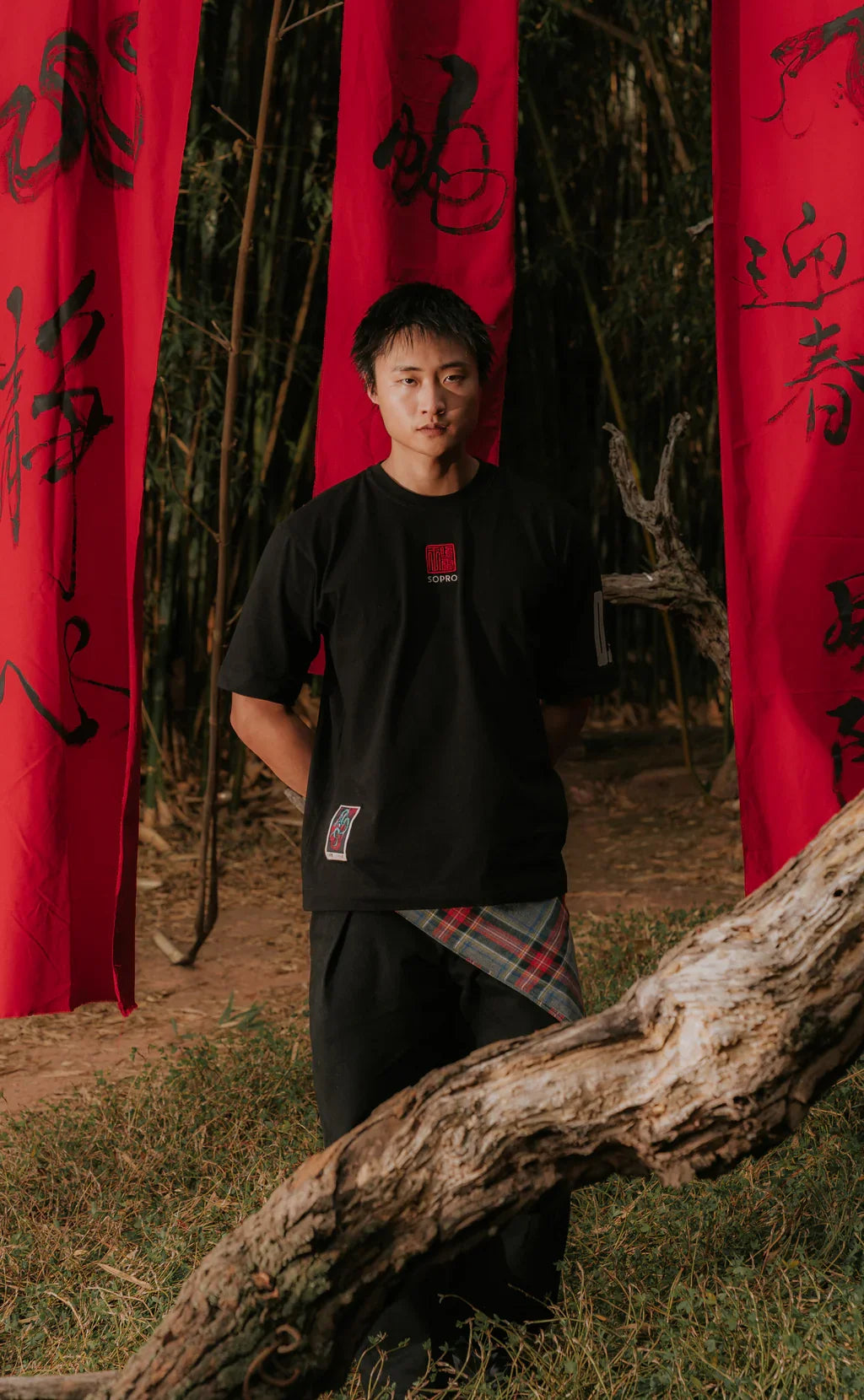 Na parte frontal, aparece o bordado do carimbo de Carol Wang no peito e a etiqueta especial da coleção aplicada na barra. Na manga, o bordado com os caracteres 气息 (qìxī) - sopro em mandarim - conecta a peça diretamente ao nome da marca.