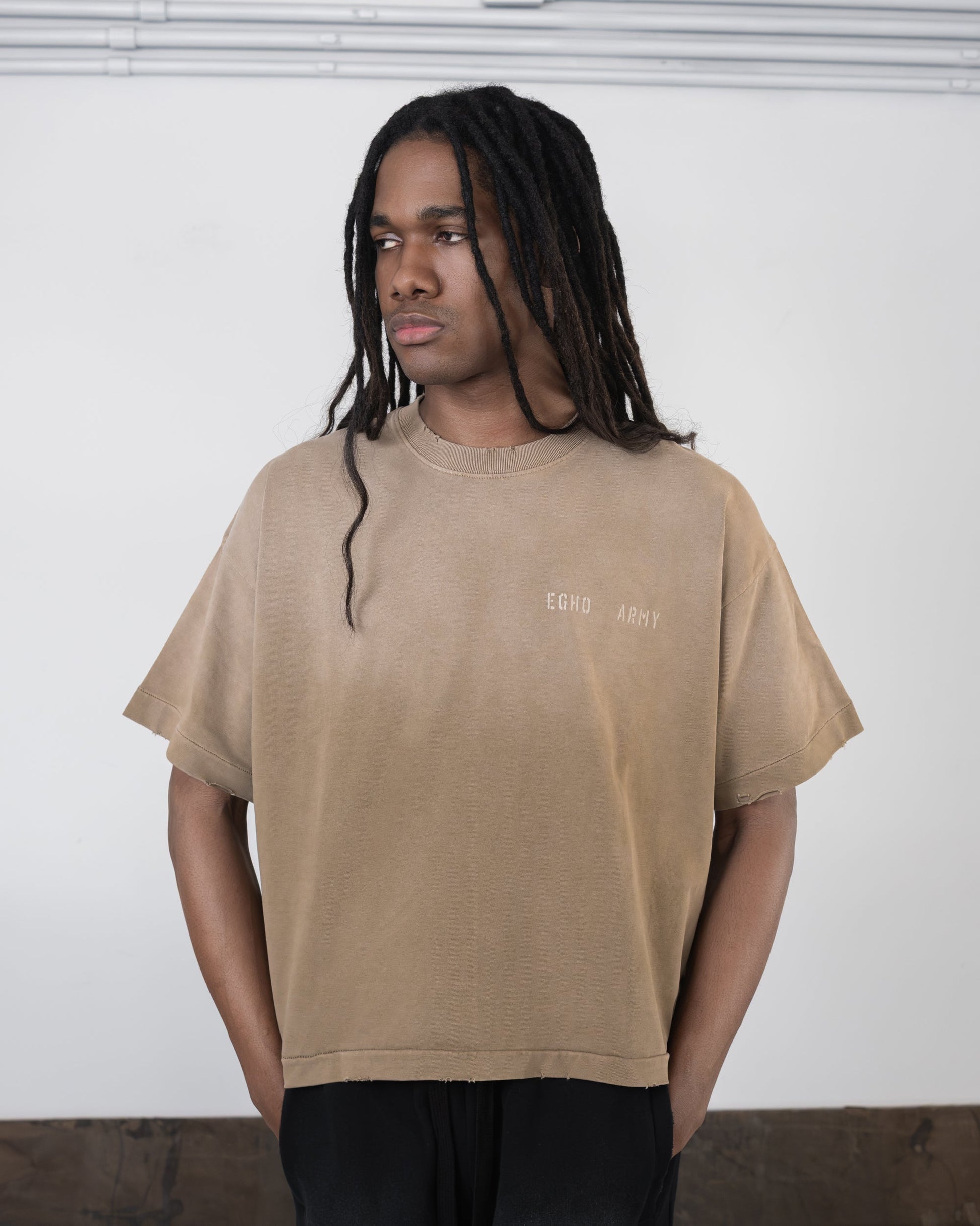 CAMISETA SUN-FADED NA MODELAGEM BOXY TRADICIONAL DA EGHO. COSTURA SINGLE STITCH. FEITA DE TECIDO 100% ALGODÃO DE ALTA GRAMATURA 274 GSM, PASSA POR PROCESSOS DE LAVAGEM PARA UM EFEITO ENVELHECIDO, PUÍDOS NAS EXTREMIDADES E Estampa em silk de subtom com acabamento desgastado.